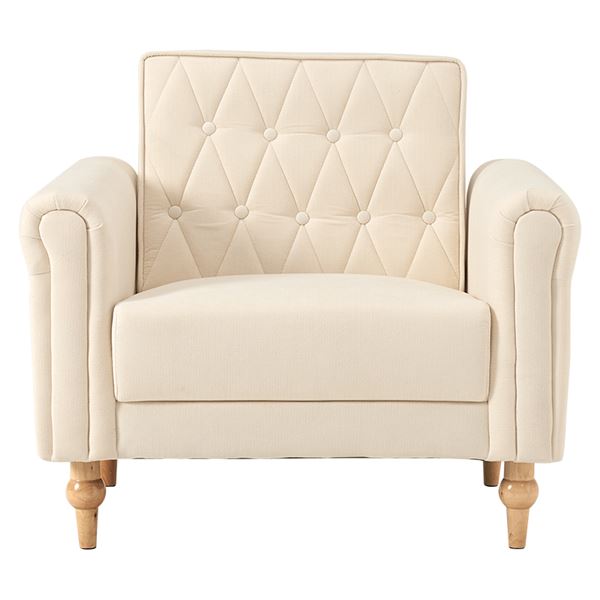 上品さと可愛らしさを掛け合わせた1人掛けソファ。背面のクロスボタンステッチや丸い肘掛けなど、こだわったデザインが魅力的