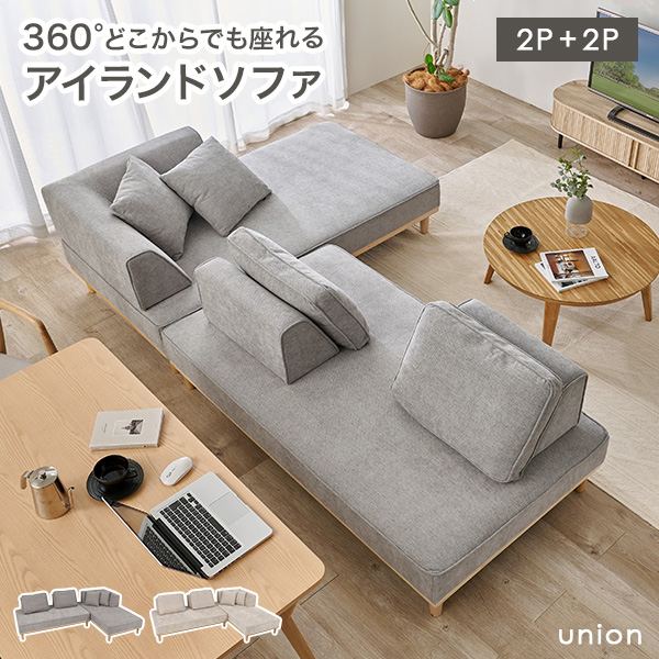 自由なくつろぎ方を叶える、360度座れるアイランドソファ。背面クッションを好きな位置に動かせる可動式デザインで、座る・寝転ぶ・もたれるなど、その日の気分に合わせてレイアウト自在。ソファの向きを気にせず、どこからでも座れる開放的な設計だから、リビングの中心に置くだけで心地よいくつろぎ空間が生まれます。家族やパートナーと同じ場所にいながら、それぞれが好きな体勢で自由に過ごせるのもアイランドソファならでは。【商品サイズ(約)】幅264×奥行170×高さ81cm【梱包サイズ(約)】(1)95×172×32cm(40kg)(2)95×172×32cm(40kg)(3)64×36×59cm(20kg)(4)82×82×32cm(20kg)【材質】本体:天然木(ラッカー塗装)張り材:ポリエステルクッション材:鋼製ばね、ウレタンフォーム【生産国】中国【備考】・組み立ては脚の取り付けのみ(工具不要)・本体・クッションのカバーは取外しできません・専用カバーは販売していません
