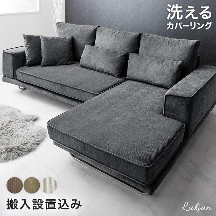 ■【正午〜P5%還元】 【搬入設置込み】 ソファ 3人掛け 洗える カバーリング コーデュロイ カウチ 左右変換OK コーナーソファ ポケットコイ