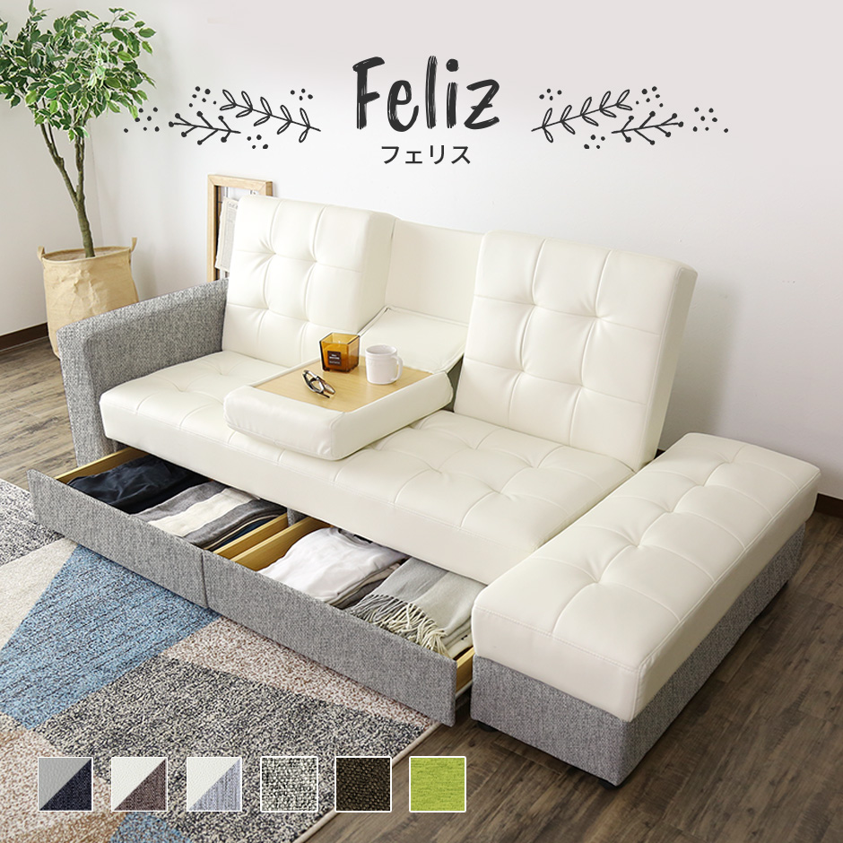 ■配送料について※別途送料対象地域のお客様はご購入手続きの際、その他要望欄へ【別途送料了承済み○○円×購入点数】と記入下さいますとスムーズな対応が可能です。・北海道:+25,000円・沖縄・離島:別途お見積り◆他商品との同梱は出来かねます。予めご了承ください。◆商品名:ソファーベッド Feliz【フェリス】◆サイズ【本体】約幅193×奥行49〜101×高さ77 座面高:36(cm)【スツール】約幅37×奥行101×高さ36(cm)◆張り材合成皮革・ポリエステル◆構造部材天然木・合板・綿・不織布・ウェイビングベルト・Sバネ(連結式鋼製組バネ)・ポリプロピレン◆クッション材ウレタンフォーム◆重量約48kg◆耐荷重【ソファ】約150kg【ベッド】約100kg【スツール】約80kg【スツール収納】約15kg【引き出し】約7kgご予約商品をご購入の場合、au PAYゆったり後払いはご利用になれません。他のお支払方法をご選択ください。