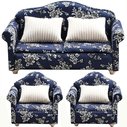 moin moin ミニチュア 家具 1/12 1:12 スケール 家具 ソファ 3点セット B品 訳アリ/ドールハウス 二人掛け 一人掛け シングル クッション ホワイト ブルー 花柄 レトロ バイカラー クッション 布 ファブリック ドール 人形 雑貨 2311mini31
