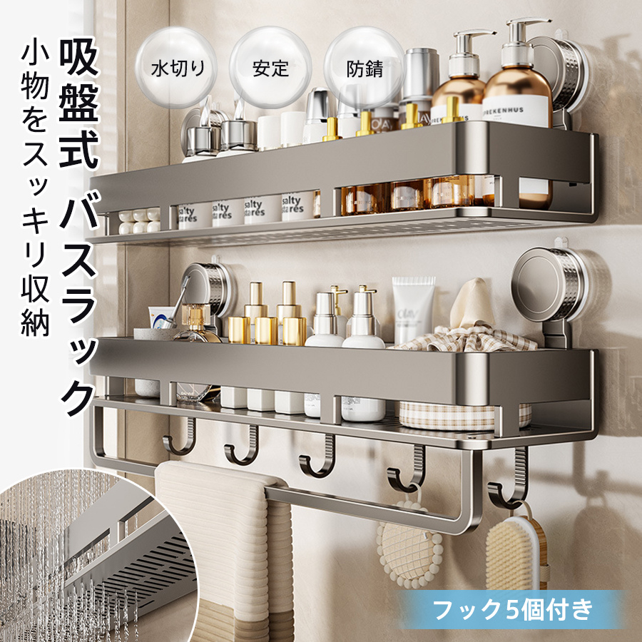 ■バスラック 浴室ラック 小物収納 吸盤式 シャンプーラック 水切り お風呂 浴室 洗面所 キッチン 収納 フック5個付き ふきん掛