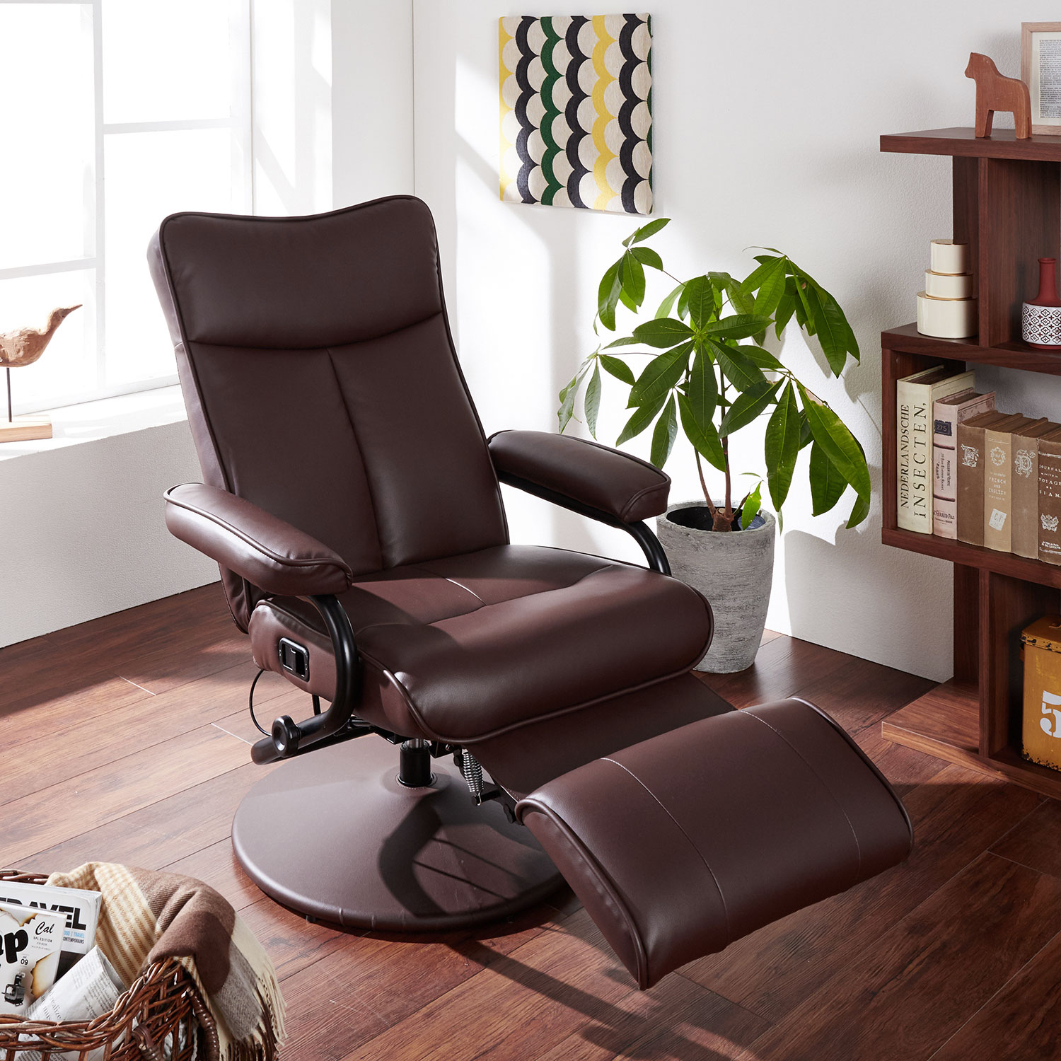 男性のワークスペースに合う、合皮張地のパーソナルチェアウレタンをたっぷりと詰めているからクッション性◎背もたれはダイヤルレバーで好きな位置でまで可動して固定でき、無段階での調節可能座面は狭いスペースでも立ち座りしやすい360度回転式足元にはフットレスを備え、身体を預けてゆったりと寛ぐことができますフットレストは足で押せば簡単にしまえます#1人用リクライニングチエア