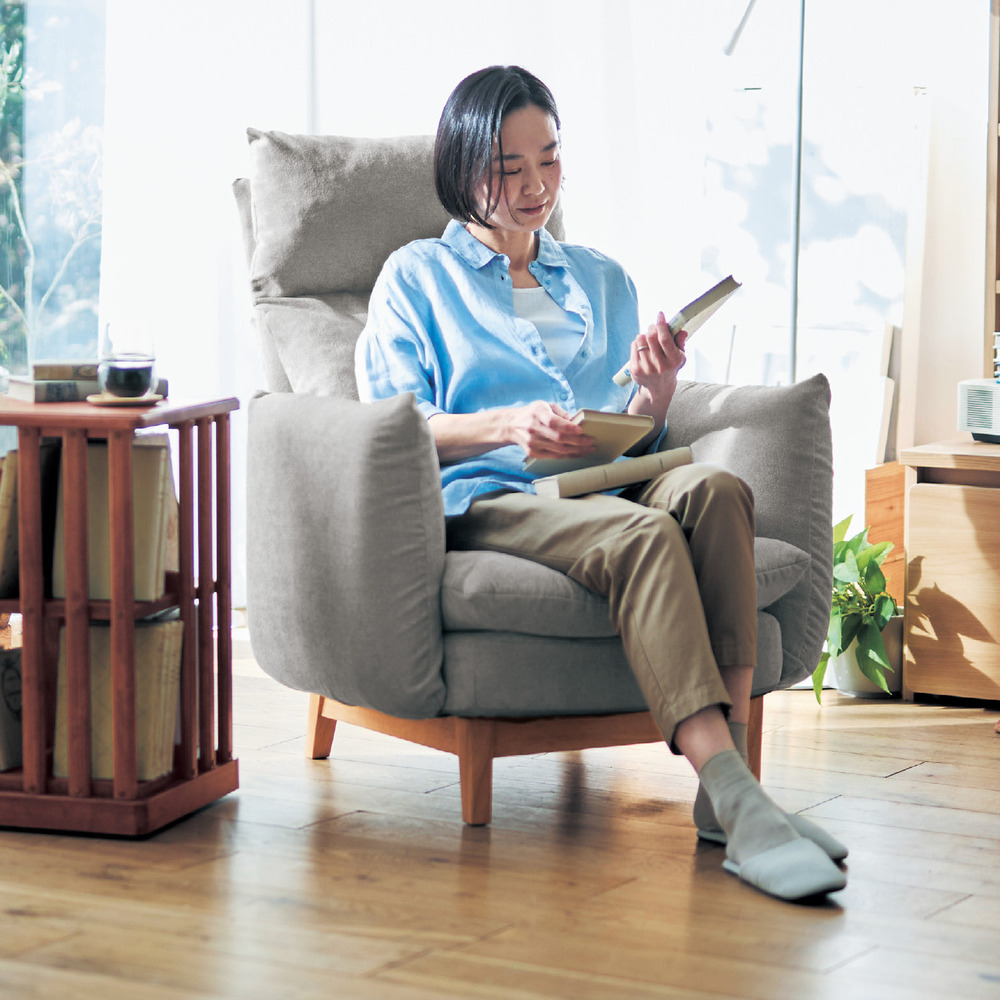 ーデザイン・スタイリングー・ふんわり気持ちいい座りごこち・ハイバックなので背中をしっかり預けられる・本を読んだり、テレビを観たり、好きな体勢でくつろげる・インテリアになじむすっきりしたデザインー素材ー・側地はやわらかな微起毛素材・脚は天然木製・ポケットコイルとシリコンフィルのダブルクッションでふんわりながらもしっかりとした座り心地ー機能ー・ヘッドは14段階、背部は6段階のリクライニング付きでお好みの角度でくつろげます