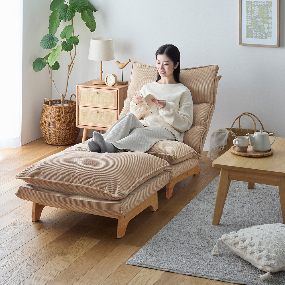 木製の脚部とボリュームのある二重クッションが特徴的なパーソナルチェア/ローソファー程よい柔らかさの厚みのあるクッションが身体をやさしく支えてくれます首元までもたれられるハイバック仕様座面が後方にゆるく傾斜しているので、身体を背もたれに預けてリラックスできます背もたれ・頭部はリクライニングできるので、ご自身のお好みの角度に調整できますお揃いのオットマンも贅沢な二重クッション構造オットマン単体でのご使用はもちろん、チェアと併せると立ち上がれない心地よさどんなスタイルにも合わせやすいベージュ、グレー、インテリアの差し色になるイエロー、グリーンの4色展開ぜひチェアとセットで至福のくつろぎ時間をご堪能ください#リラックスチェア #1人暮らしにおすすめ #ハイチェア #ハイバックチェア