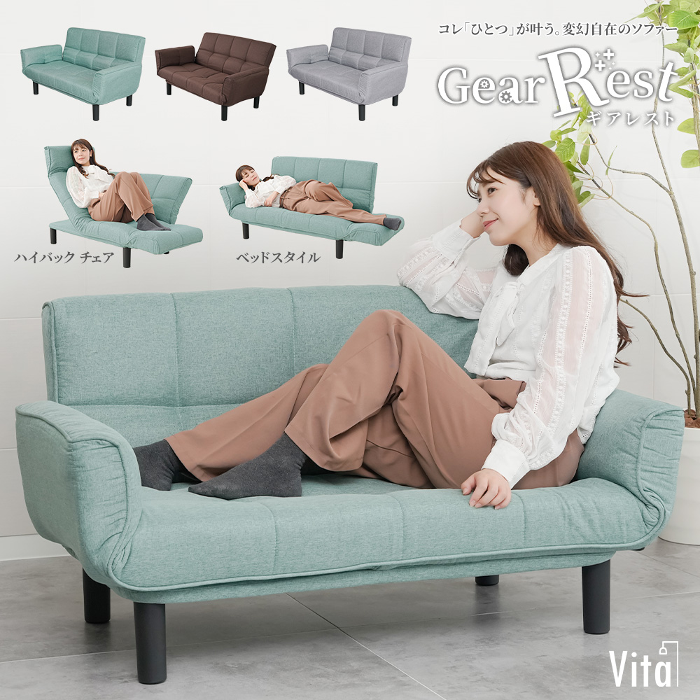 ■ソファーベッド 耐荷重160kg 4点リクライニング 一体型オットマン コンパクト ロータイプ カウチ 頑丈 ハイバック 脚付き 日本製ギア お