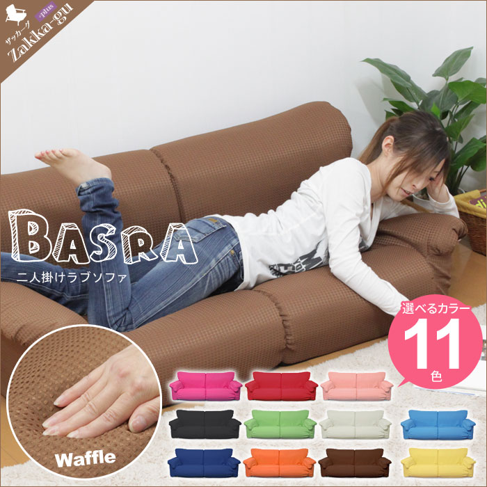 全11色から選べる2人掛けラブソファー。優しいワッフル素材のフォルムがお部屋さらに可愛いく明るくします。カラーはレッド、ブルー、グリーン、アイボリー、ブラウン、ブラック、ピンク、サクラピンク、オレンジ、スカイブルー、イエローよりお選びいただけます。■サイズ:約約幅135×奥行71×高さ46cm(座面高20cm)■重量:約5.4kg■座面部内寸:幅95×奥行49×高さ33cm(肘までは15cm)■張地:ポリエステル100%・撥水加工■中材:ウレタンフォーム■生産国:日本■梱包数:1個口