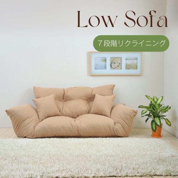 ■ソファ カウチ ソファベッド ラブソファ 2人掛け リクライニング ロータイプ ゆったり クッション2個付き ベージュ