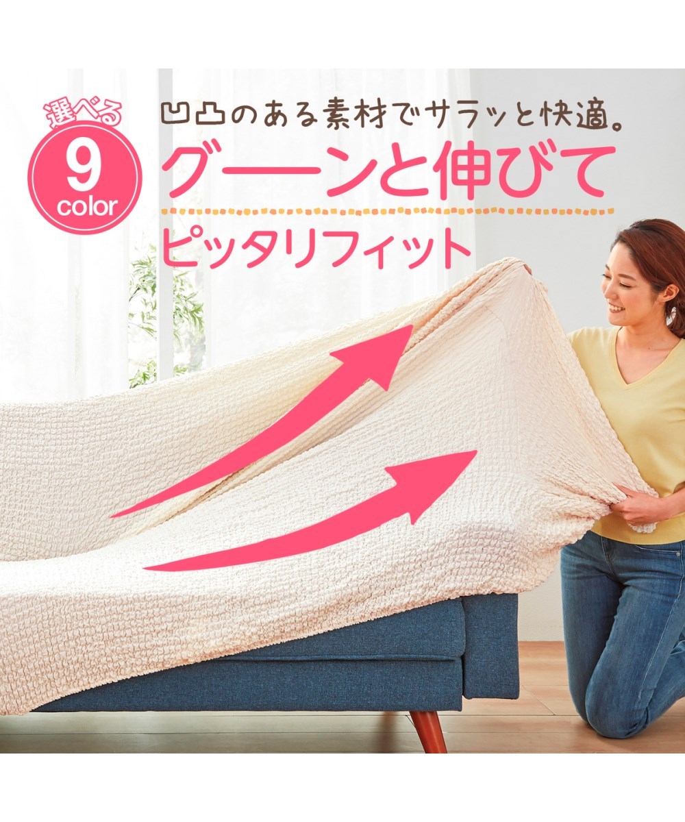 布をくしゅくしゅと縮めたタテヨコに伸びるストレッチ生地だから、どんな形のソファーにもピタッとフィット。生地がとってもよく伸びるから簡単に美しく装着でき、包み込むだけで使い込んだソファーもまるで新品のように生まれ変わります。汚れても手洗いできるので清潔です。ほどよく肉厚な素材は肌ざわりも抜群。ズレを防ぐたるみ防止パイプ付です。