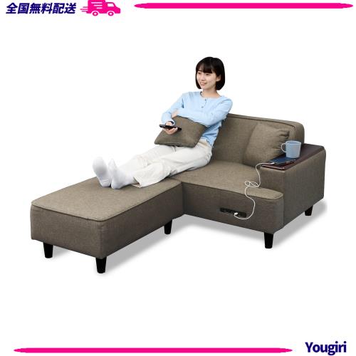 ■[山善] ソファ (カウチソファ) 2人掛け 木製肘掛け/2口コンセント/USBポート/クッション2個付き ロボット掃除機が通れる レイアウト自由