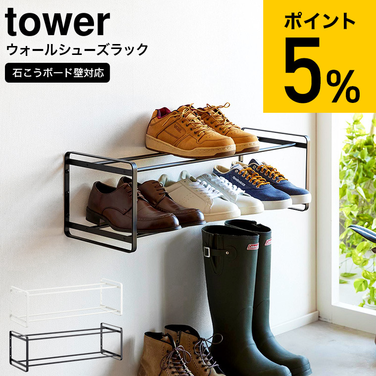 ■tower 山崎実業 石こうボード壁対応ウォールシューズラック タワー 2段 ホワイト ブラック 4504 4505 送料無料 靴箱 玄関 収納 靴置き 下