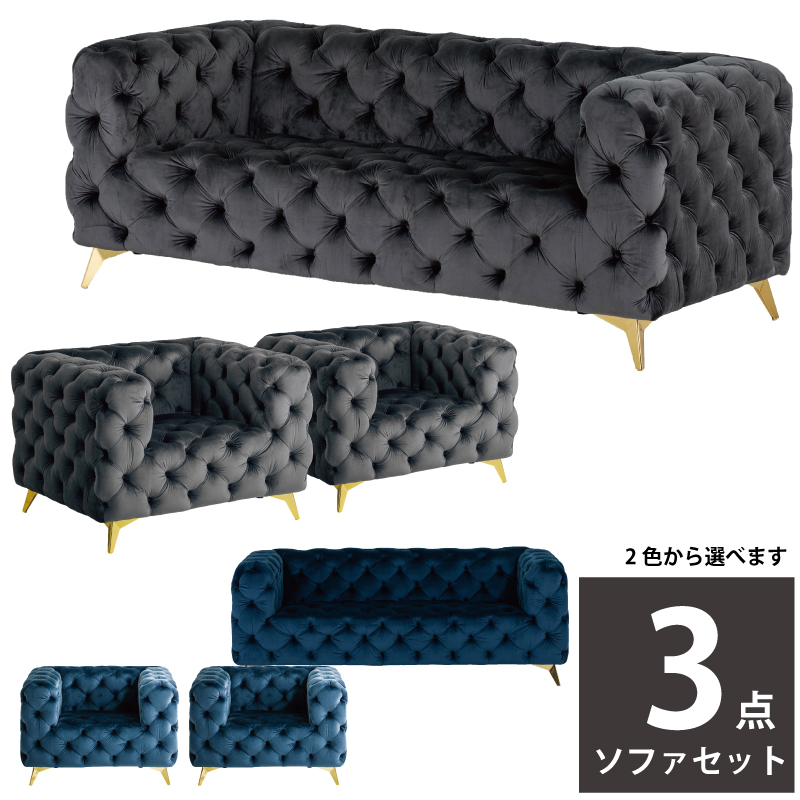 ■法人宛 送料無料 ソファ3点セット ソファセット ベルベットソファ 幅191cm 3人掛け 幅100cm 1人掛け アンティーク クラシックソファ グレ