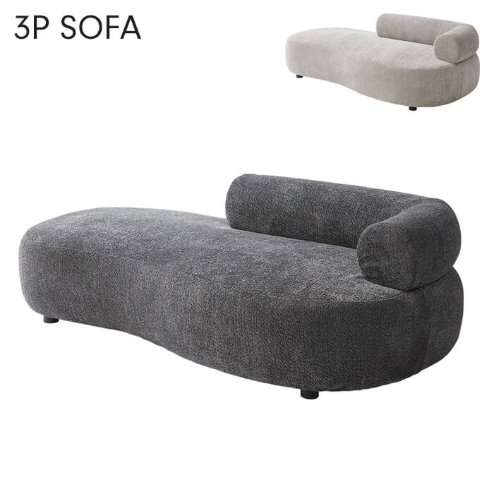 丸みを帯びたフォルムがやわらかく、包み込まレスような座り心地の三人掛けソファ。背もたれと肘掛けが一体となった独特なデザインで、横になってももたれかかってもどんな姿勢でも心地よく快適に過ごせます。生地は短い毛足でふんわとした滑らかで優しい触り心地。さらに程よい弾力のあるクッション性と相まって極上のくつろぎをサポートします。背面まで同じ生地で仕上げ、壁付けだけでなく、お部屋の中央においてもおしゃれに決まるデザインになっています。キーワード: ソファ 3人掛け 3人用 ソファー 椅子 ゆったり 木製フレーム クッション ファブリック 可愛い 高級感 おしゃれ ユニーク ローソファ フロアソファ シンプルソファ 三人用 3P チェア 椅子 ロータイプ スチール 布製 ファブリック 丸み ゆったり スタイリッシュ コンパクト おしゃれ