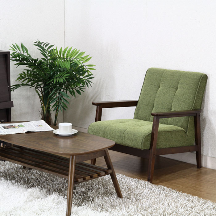 あたたかみのあるファブリック素材で優しい空間を演出する1人掛けソファです。どこかしら懐かしいカラーとインテリア性の高いアンティークの質感は、お部屋の雰囲気作りにピッタリです。座面は奥にかけて傾斜がついており、深い座り心地でリラックスできます。ゆったりとくつろげるひじ置きは味わいのある天然木を使用しており、使うほど味わいが出てきますので日に日に愛着が出てきます。