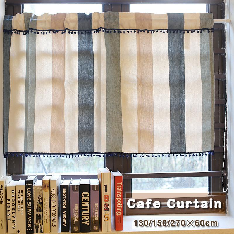 ■【ポイント10倍!】カフェカーテン 小窓用 間仕切りカーテ 棚飾り 遮光 和風 北欧 目隠し ストライプ柄 毛玉飾り おしゃれ 喫茶店 キッチ