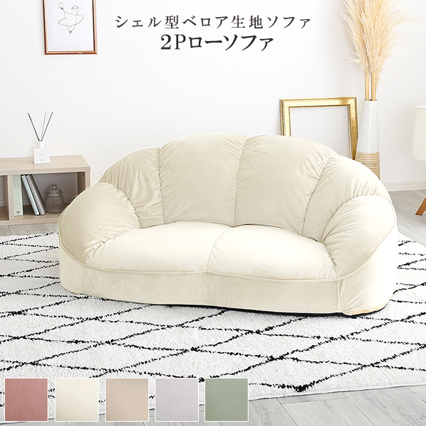■シェル型 ローソファ 2人掛け(アイボリー) 全5色 ベロア調生地 くすみカラー シンプル かわいい 軽量 コンパクト ボリュームクッション