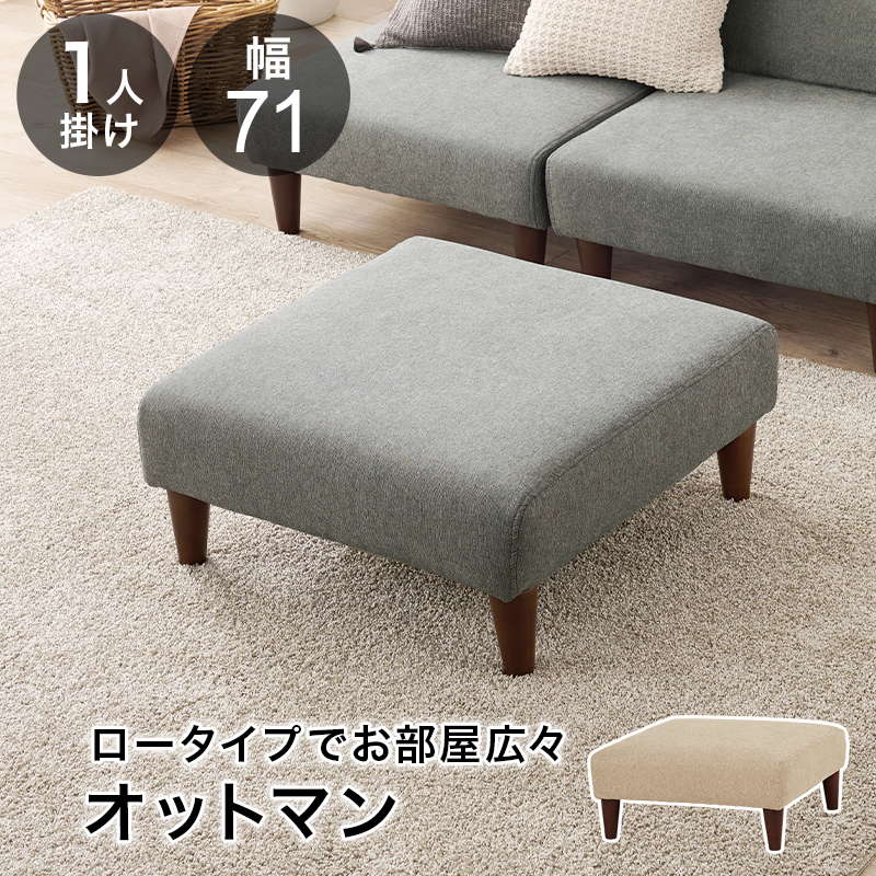 ■商品説明 ●狭いお部屋にフィットする組み換えソファ オットマン単品 ●組み合わせが自由で、自分好みの理想の配置に設置することができます。 ●ロータイプソファーで、お部屋が広く感じられ圧迫感がありません。 ●L字・セパレート・直列・ゲストスタイルなど様々な形状に変化可能です。 ●広めの座面と背もたれで、全身を預けてリラックスして頂けます。 ●弾力と張りのある少し硬めの座り心地。程よい固さなので長時間座っても疲れにくく、楽に立ち上がれます。 ●張地は耐久性の高いポリエステルを採用。さらさらと心地良い肌触り。 ●脚部には天然木を贅沢に使用。美しい木目が柔らかな雰囲気と高級感を演出します。 ●脚を取り外すとロースタイルに、小さいお子様やペットがいるご家庭にも安心です。 ■商品詳細 生産地:中国製 サイズ:(約)幅71×奥行71×高さ33/20cm 素材:フレーム:天然木、張地:ポリエステル 組立:完成品(脚部のみお客様取り付け)