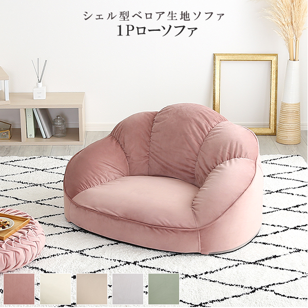■シェル型 ローソファ 1人掛け(ピンク) 全5色 ベロア調生地 くすみカラー シンプル かわいい 軽量 コンパクト ボリュームクッション ソ