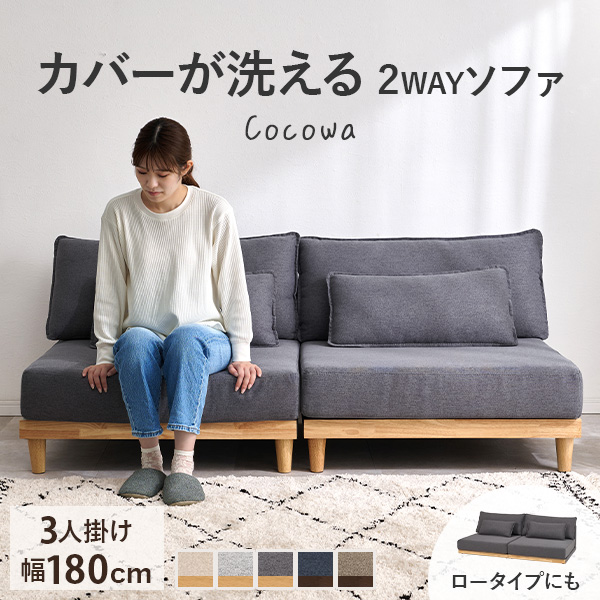 天然木が優しい2wayソファ「ココワ」お掃除ロボットが通れる脚付きタイプ。ロースタイルでお子様やペットにやさしい高さ。上り下りしやすいので家族全員でゆったりと過ごせます。分割式なのでレイアウトも自由自在。サイドテーブルを挟んだり、対面で設置したりできます。ジョイントテープが付いているので連結時もズレません。あぐらやごろ寝もできるサイズ感で天然木のアクセントと、さらっとした肌触りの生地。背もたれや座面クッションが取り外せます。さらにカバーは洗濯可能。清潔にお使いいただけます。【商品サイズ(約)】1台あたり:幅90×奥行91×高さ69cmロータイプ時:幅90×奥行91×高さ59cm【梱包サイズ(約)】(1)89×88×56cm(41.2kg)(2)25×17×13cm(1.5kg)【材質】本体:天然木脚部:塩化ビニル樹脂、天然木生地:ポリエステルクッション材:ウレタンフォーム【生産国】中国【備考】組立品(工具付属)