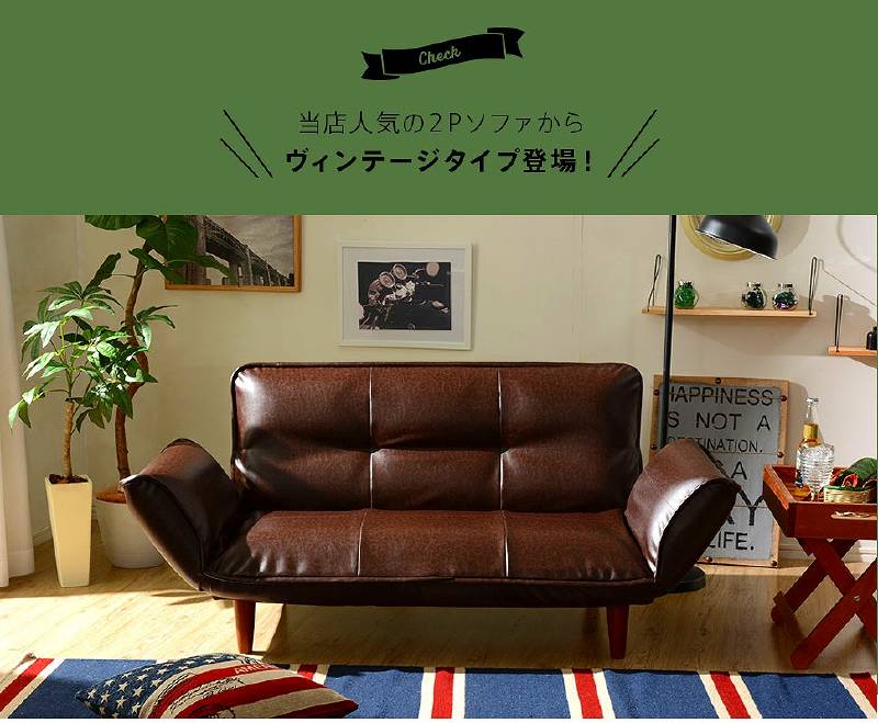 人気のカウチソファ2Pに、ヴィンテージタイプが登場。 シンプルで、レトロな風合い。 オシャレな空間をお作り頂けます。 コンパクトサイズで、リクライニング機能も搭載しております。