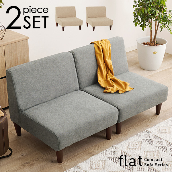 一人掛けソファ2個セットで、組み替えて使えるユニットソファ。並べて2人掛けソファとして使うことはもちろん、L字に並べたり、間にテーブルを置いて映画館のように楽しむことも。広めな座面なのでゆったりとリラックスすることができます。弾力のある座り心地なので長時間座っても疲れにくく、食事や作業をする時にも向いています。シンプルなファブリックと深い色味の木脚なので高級感もあり、ナチュラルインテリアからモダン系まで幅広いインテリアに合わせることができます。「フラットシリーズ」は単品でも販売してるので、追加で購入して組み合わせて使うこともおすすめです。【商品サイズ(約)】(ソファ1個)幅71×奥行71×高さ53/66cm【梱包サイズ(約)】(1)72×72×54cm(25kg)(2)72×72×54cm(25kg)【材質】脚:天然木(ラッカー塗装)生地:ポリエステルクッション材:ウレタンフォーム【生産国】中国【備考】脚のみ取り付け(工具不要)