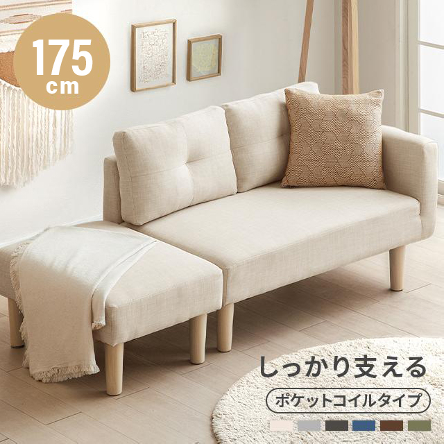 ■ソファ カウチソファー ワイドスツール付き 2人掛け 2P 2口コンセント 脚 肘付き 肘あり ファブリック 北欧 シンプル モダン おしゃれ 脚
