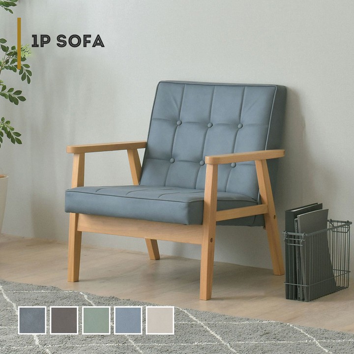 低めのダイニングテーブルにピッタリな一人掛けソファ。背もたれには同カラーのボタンを配置して北欧風のシンプルでおしゃれなデザインになっています。使うほどに味わいが増していく天然木を使用。オールシーズン気持ちよく使えるファブリック素材。背面と座面にはウレタンフォームが入っています。脚部と床との接地面の先端は丸く加工し、床を傷つけにくい処理をしています。カラーはグリーンとブルーの2色展開。