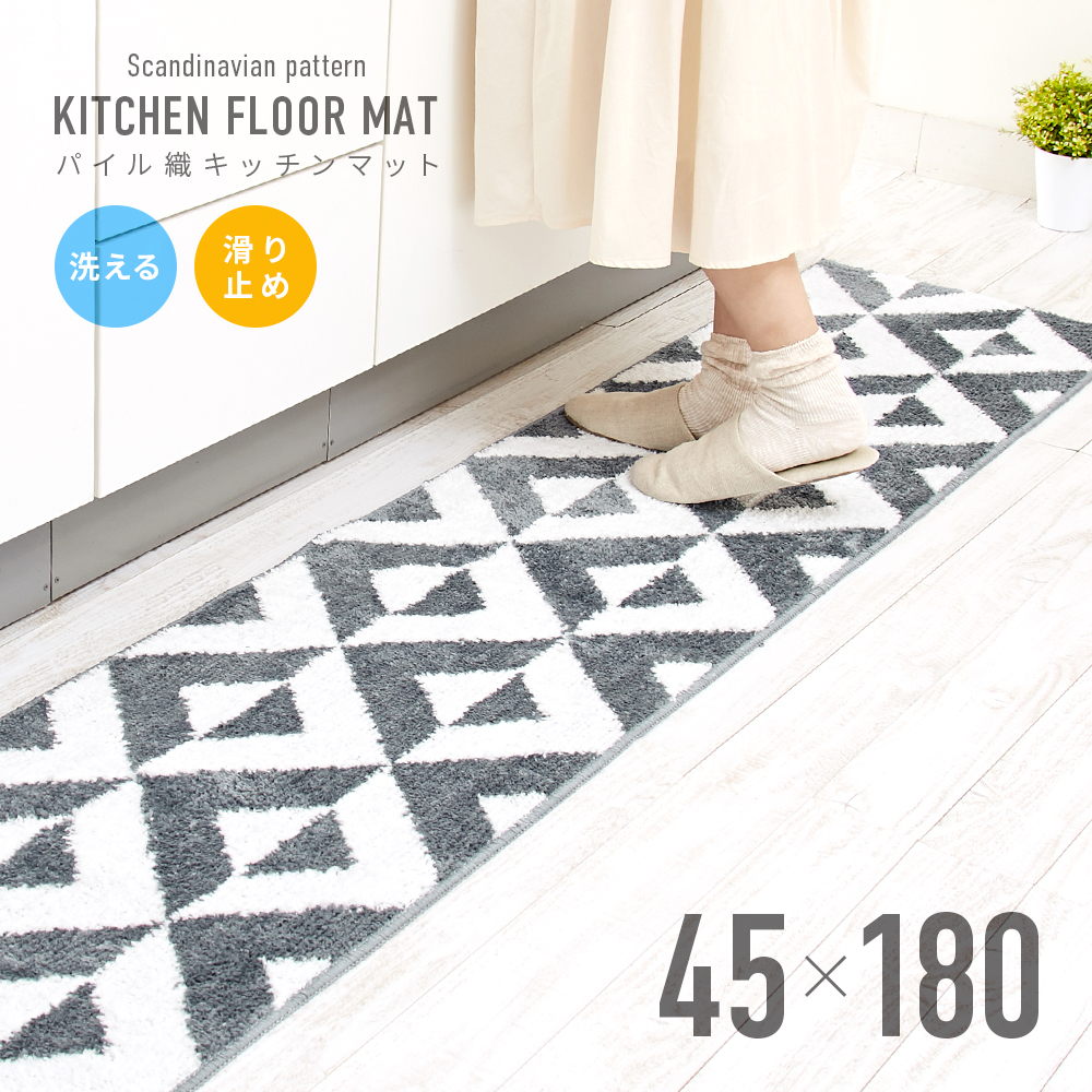 モダンな北欧テイストがキッチンをおしゃれに演出。踏み心地の良いパイル織のキッチンマット。裏面はすべり止め加工。【商品サイズ】180サイズ/(約)45×180cm【パッケージサイズ】180サイズ/(約)25×31×8cm【材質】表生地/ポリエステル100%、裏生地/ポリエステル100%(不織布)【原産国】中国