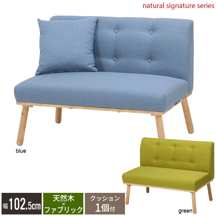 低めのダイニングテーブルにピッタリな二人掛けソファ。背もたれには同カラーのボタンを配置して北欧風のシンプルでおしゃれなデザインになっています。使うほどに味わいが増していく天然木を使用。オールシーズン気持ちよく使えるファブリック素材。背面と座面にはウレタンフォームが入っています。脚部と床との接地面の先端は丸く加工し、床を傷つけにくい処理をしています。カラーはグリーンとブルーの2色展開。同色のクッション1個付。