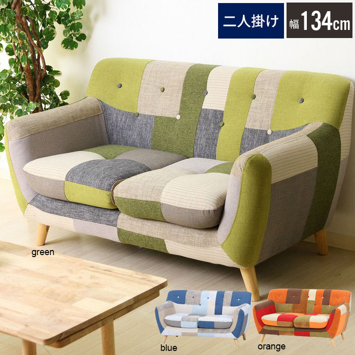 ■ソファ 二人掛け パッチワーク 布張り ファブリック オレンジ グリーン ブルー 肘付 いす 椅子 天然木 グリーン ブルー 北欧テイスト 2人