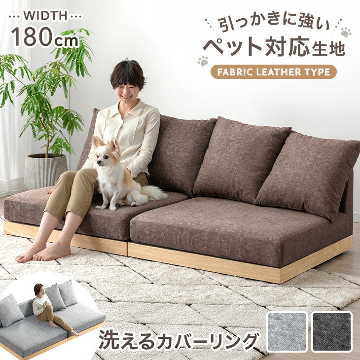 ■ソファ ローソファ 2人掛け 引っかきに強い フロアソファ 洗える カバーリング 180cm ファブリックレザー ペット 対応 3人掛け ウッドフ