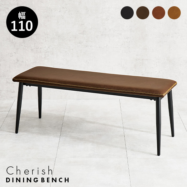 まるで本革のような合成皮革を使用した、ヴィンテージ風ベンチ「チェリッシュ」本革よりもお手入れが簡単なPVCレザーに無骨なブラックスチール脚を合わせました。シャープでありながらインダストリアルな雰囲気も出してくれます。座面は長時間座っても疲れにくいウレタンクッション入り。ダイニングベンチや玄関ベンチとしてご使用いただけます。ブラック/ブラウン/キャメル/ダークブラウンの4色からお選びいただけます。【商品サイズ(約)】幅110×奥行36.5×高さ43cm【梱包サイズ(約)】118×38×10cm(8.4kg)【材質】脚部:スチール(粉体塗装)座部:積層材生地:合成皮革クッション材:ウレタンフォーム【生産国】中国【備考】組立品(工具付属)