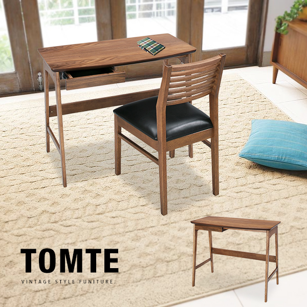インテリアに北欧ヴィンテージのエッセンスを。北欧ヴィンテージ家具の雰囲気をまとった木製家具TOMTE(トムテ)シリーズ。TOMTE(トムテ)とは、スウェーデン語で「小人」という北欧の妖精の名前。モダンでありながらどことなく懐かしいデザイン。天板のウォルナットの木目が美しく、上質感があります。こちらのデスクは場所を取らない奥行45cmのスリムタイプで、窓際・壁際に省スペースで置けます。PCデスクとしてはもちろん、ドレッサーとしても。天板には緩やかなカーブをつけており、小物を入れられる引出し収納付き。北欧ヴィンテージのファンの方をはじめ、ミッドセンチュリー、カフェ風テイストが お好きな方にもおすすめです。ダイニング、ソファからテレビボードまで、トータルコーディネートがお楽しみいただけます。 【商品情報】 幅90cm×奥行45cm×高さ70cm 引き出し:幅 25.5cm × 奥行 26cm × 高さ 4cm 素材 ウォールナット突板 天然木(ラバーウッド) ウレタン塗装 重量10kg お客様組立品※15分程度 ・こちらの商品は「テーブルのみ」となります。 ・引き出しは取り外し可能です。