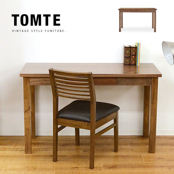 インテリアに北欧ヴィンテージのエッセンスを。北欧ヴィンテージ家具の雰囲気をまとった木製家具TOMTE(トムテ)シリーズ。TOMTE(トムテ)とは、スウェーデン語で「小人」という北欧の妖精の名前。モダンでありながらどことなく懐かしいデザイン。天板のウォルナットの木目が美しく、上質感があります。こちらのデスクは幅120cm奥行53cmあり、パソコンなどを置きながら書類を広げたりと、ゆったりと使えます。PCデスクとしてはもちろん、ドレッサーとしても。小物を入れられる引出し収納付き。北欧ヴィンテージのファンの方をはじめ、ミッドセンチュリー、カフェ風テイストが お好きな方にもおすすめです。ダイニング、ソファからテレビボードまで、トータルコーディネートがお楽しみいただけます。 【商品情報】 W120×D53×H72cm 天然木(ラバーウッド) 天然木化粧繊維板(ウォルナット) ウレタン塗装 引出付 耐荷重30kg 組立式(15〜30分程度) ・こちらの商品は「デスクのみ単品」となります。