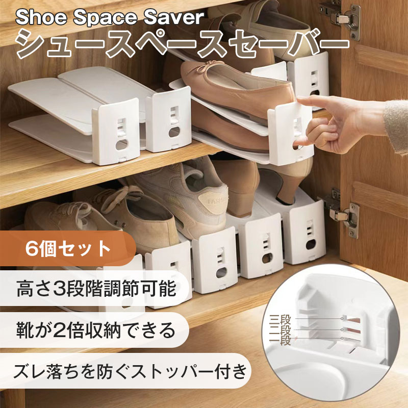 ■シュースペースセーバー 6個セット 靴 収納 シューズホルダー 省スペース 収納量2倍 男女兼用 高さ調節可能 玄関 下駄箱 引っ越し プレゼ