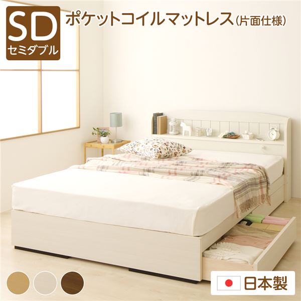 ■セミダブルベッド 白 ホワイト 収納ベッド ポケットコイルマットレス付き 片面仕様 白 ホワイト 棚付き コンセント付き 日本製 国産 日