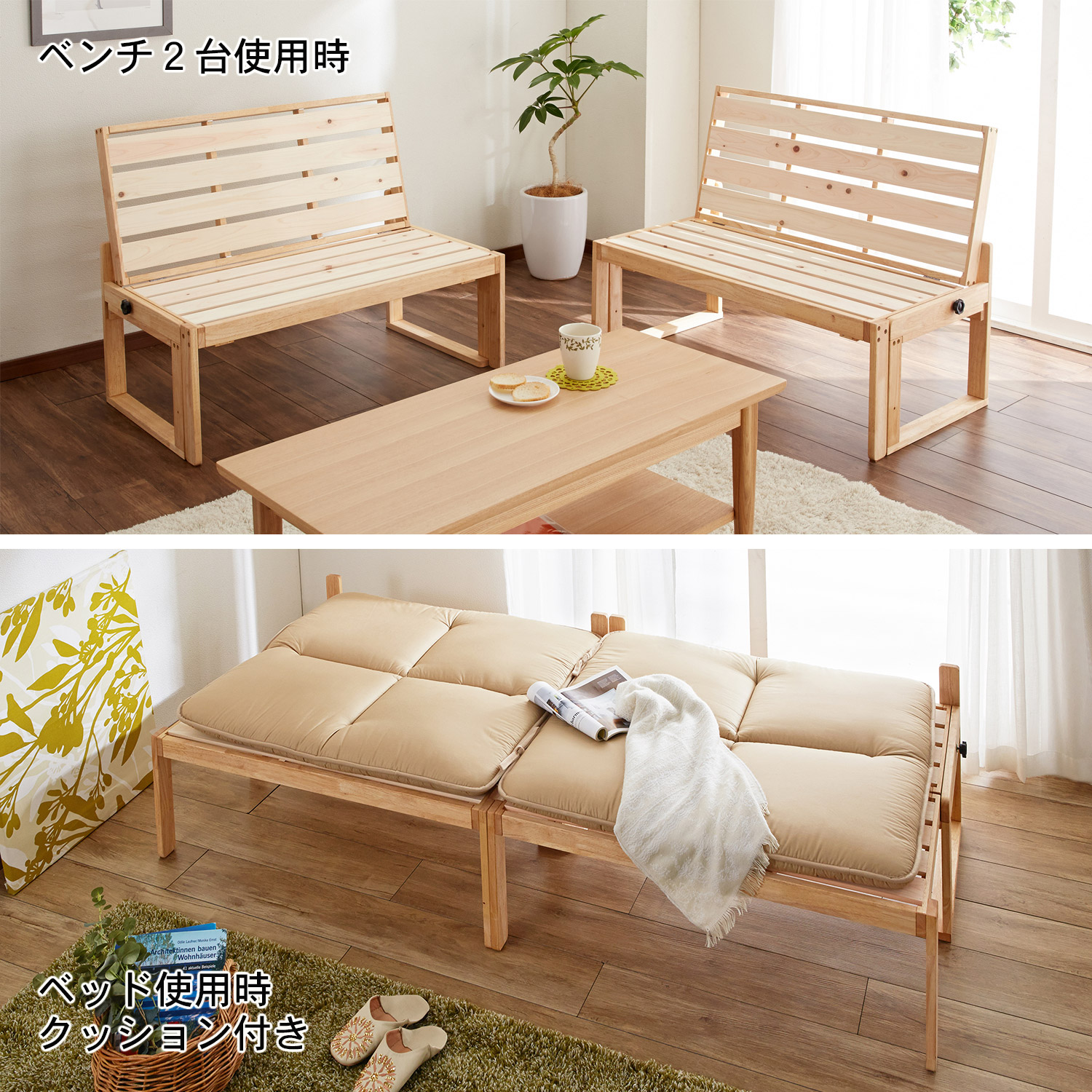 フラットにするとベッドに、背もたれを立てるとベンチになる、ナチュラルカントリーな雰囲気がかわいいソファーベッドですさらに真ん中で切り離して2台のベンチとしても使うこともできるので、来客時などにもとっても便利背もたれはサイドのストッパーを緩めてフラットにする仕様で、女性でもひとりで簡単に調節できます本体は丈夫なラバーウッド製、すのこ部分は吸放湿性に優れたひのきを使用した純国産製品です底付きしない、座り心地・寝心地抜群の「クッション」は、紐で結んで1枚に繋げて使うことが可能です「ベッドのみ」「クッション付き」をお好みでお選びください