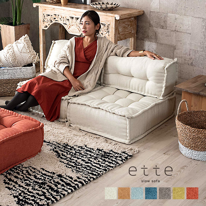 ゆったりとした時間を楽しむフロアクッションシリーズ、"ette -slow sofa- (エット・スロウソファ)"くつろぎ空間に彩りを与えてくれる、パレットのような豊富なカラーバリエーションです。ライフスタイルに合わせて、自分ならではの組み合わせを楽しんで。■サイズ(cm):組み合わせた時|約 W60 × D75 × H49バッククッション|約 W60 × D28 × H28マルチクッション|約 W60 × D75 × H21※多少サイズは前後します。■重量:組み合わせた時|約 5.9 kgバッククッション|約 1.8 kgマルチクッション|約 4.1 kg■素材:表生地 内生地 ポリエステル100%中材 ウレタンフォーム バネ■生産国:中国■北海道・沖縄・離島は追加運賃がかかります。■ご注意:※注意事項はページ内<ご注意>箇所に掲載しております。そちらを必ずご確認お願いいたします。
