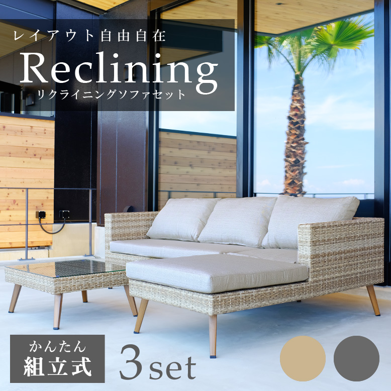 ■商品名 【カーデンファニチャー3点セット】 パラオ ラウンジ3点セット Palau Lounge set ■サイズ(cm) 2シーターソファ 約 横幅150×奥行き75×高さ64cm カウチソファ 約 横幅75×奥行き150×高さ64cm (5段階リクライニング:約 高さ32〜86cm) テーブル 約 横幅64×奥行き75×高さ32cm テーブル天板ガラス厚み 約 0.5cm(滑り止め吸盤4個付) クッション サイズ(cm) 2シーター座面用 約 横幅140×奥行き65×厚み8cm カウチソファ座面用 約 横幅75×奥行き140×厚み8cm 背当てクッション 約 横幅70×奥行40×厚み18cm ■梱包サイズ(cm) 約 163×88×57cm【350サイズ】 ■材質 ソファ・テーブル本体:人工ラタン(ポリプロピレン)・アルミ 脚:アルミ テーブル天板:強化ガラス ■カラー 本体:ナチュラル グレー クッション:ナチュラル / ベージュ グレー / グレー ■形式 組立式 ※脚を取り付けるだけの組立です。
