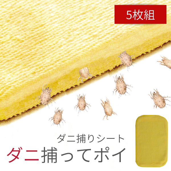 ダニ研究の専門家が開発した「ダニ捕ってポイ!」 ダニがシートに入り込んだら、粘着テープにくっついて一網打尽! 誘引剤は安心の食品添加物なので、お子様のいらっしゃるご家庭でも安心。 ペットやお子様が何気なく掻く仕草は、もしかしたらダニが原因かもしれません。 布団やクッションを天日干ししても、ダニは裏側に移動するだけとも言われています。 発煙タイプや殺虫剤に抵抗のある方におすすめです。 このダニ捕りシートは、気になるところに敷いておくだけで、食品添加物がダニを引き寄せ、粘着剤で捕えて退治します 三カ月たったらゴミとして捨てられる手軽さもうれしいですね 本体サイズ(1枚):縦24.8×横14.5cm 内容量 5枚入 材質 生地:綿100% 粘着剤:スフ、ゴム系粘着剤 誘引剤:食品添加物 有効面積:1枚で約2〜3畳 原産国 日本製 ※縫製上、若干サイズが異なる場合がございます。
