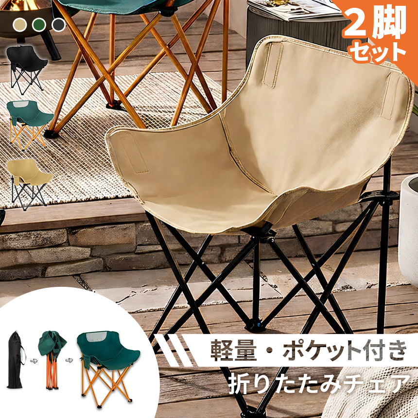 ■2脚セット 折りたたみ アウトドアチェア コンパクト ポケット付き 収納袋付き キャンプ 椅子 チェア レジャー 釣り BBQ ベランダ 室内 外