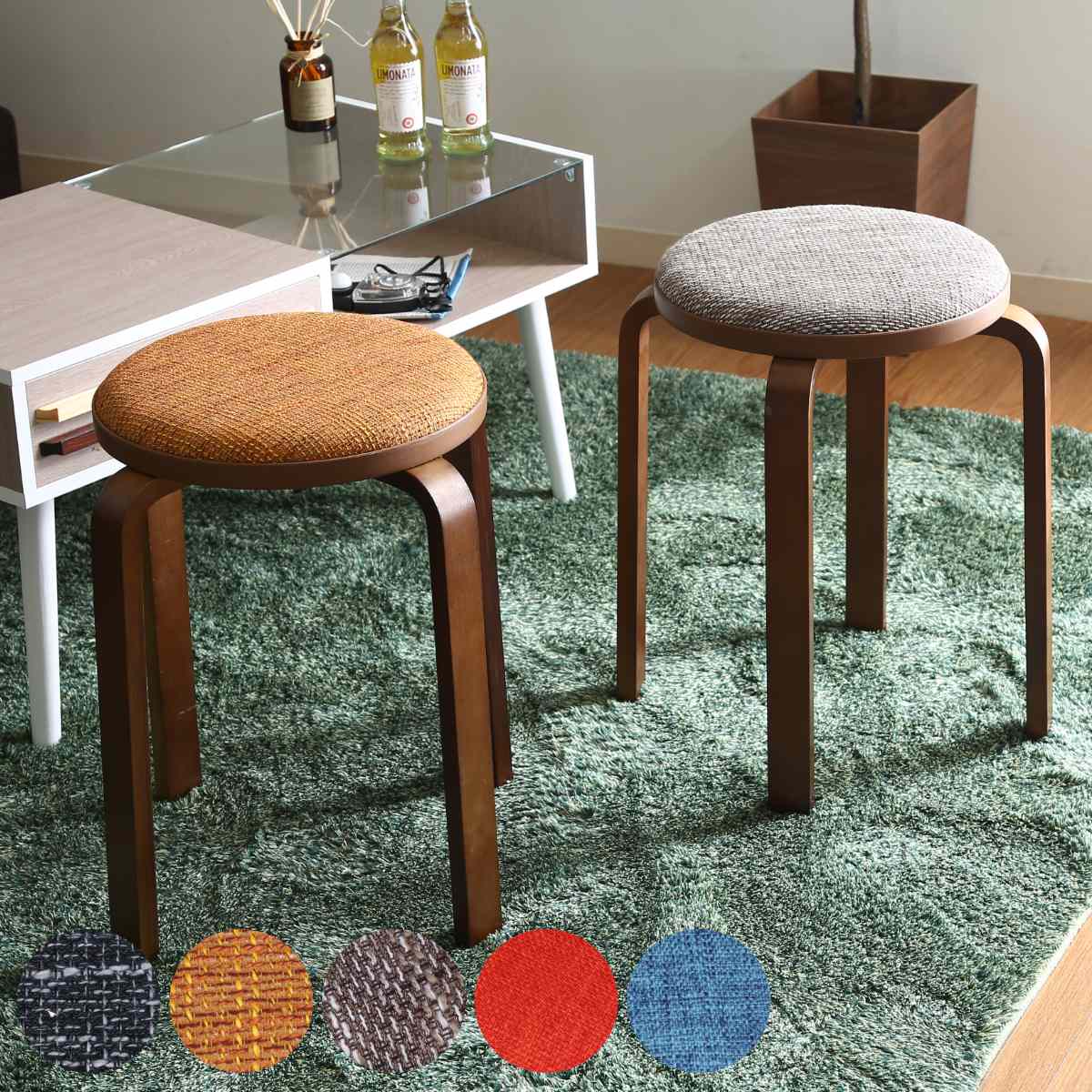 ■スツール 木製 高さ47cm スタッキング 曲木 円型 クッション ( 丸 椅子 ファブリック コンパクト アンティーク調 レトロ 来客用 リビン