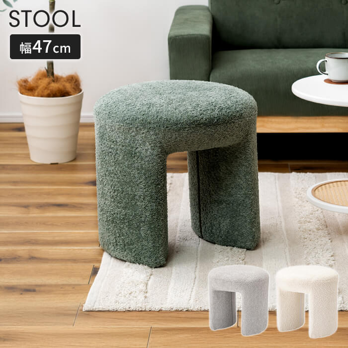 オブジェのようなユニークなフォルムのスツール。◇角の丸いフォルムが魅力的で、心地良い肌触りのブークレ生地を使用したスツール。◇シンプルな色味と素材はお部屋に合わせやすく、センスの良い空間を演出。◇脚の間が空いたデザインなので圧迫感も与えません。◇しっかりとした座り心地のフツール。◇スツールとして使うだけでなく、他のチェアなどと合わせてオットマンとしても。◇ソファ横のサイドテーブルとしても使いやすいサイズ感。◇お手伝いをしているようなフォルムも魅力的。◇落ち着きのある優しい色合いのブークレ生地。キーワード: スツール 丸椅子 ラウンド チェア イス 腰掛 円形 ブークレ生地 背もたれなし アームレス シンプル 無地 おしゃれ オットマン 1人掛け 簡易椅子 来客 サイドテーブル グリーン リビング 玄関 いす 北欧