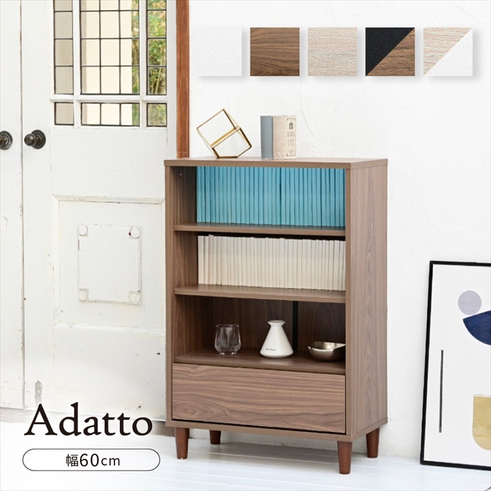 オープン&チェスト。6つのデザインと5つのカラーからお選びいただける6デザインキャビネット"Adatto"。オープン部分にはディスプレイ、引出しには見せたくないものを収納。■ 素材・材質 ■【WH:ホワイト】[本体]プリント紙化粧合板[天板]合成樹脂化粧合板(PVC)[引き出し前板]合成樹脂化粧繊維板(PVC)[脚]天然木【BR:ブラウン】【NA:ナチュラル】[本体]プリント紙化粧合板[引き出し前板]プリント紙化粧繊維板[脚]天然木【BKBR:ブラック×ブラウン】[本体]プリント紙化粧合板[天板]合成樹脂化粧合板(PVC)[引き出し前板]プリント紙化粧繊維板[脚]天然木【NAWH:ナチュラル×ホワイト】[本体]プリント紙化粧合板[引き出し前板]合成樹脂化粧繊維板(PVC)[脚]天然木キーワード: リビングラック スリム チェス 引出し付きリビングチェスト モダン キャビネット ミッドセンチュリー 引き出し ロータイプ 高さ 80 90 ロー チェスト オープン 収納 引き出し付き 組み合わせ 壁面収納