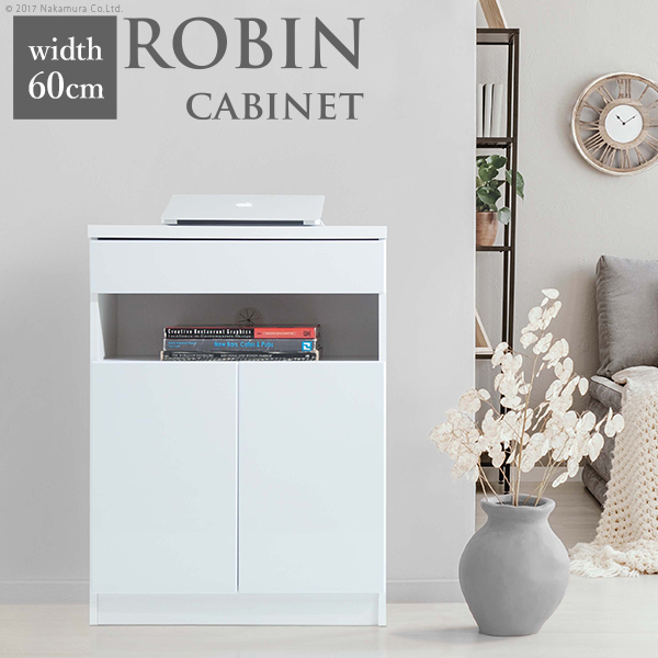 ■キャビネット 白 リビング収納 配線収納-ロビンキャビネット 幅60cm チェスト サイドボード モデム収納 ルーター収納 鏡面 白家具 ホワイ