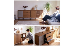 スリットデザインと流れ杢が特徴のキャビネットです。天板と前板は無垢材を使用しており、本物の木の質感を感じることができます。前板は一枚の板から切り分け、同じ木目が揃う流れ杢(木目の流れが同じ)で仕上げています。引き出しは桐無垢材で製作しているため、防虫機能、湿度の調節機能があります。扉にはソフトクローズ丁番を使用しているので、強くしめても、途中でブレーキがかかり、ゆっくり閉じていきます。自然工房の無垢製品はすべてF & star;☆☆☆の素材で製作しています。塗装もJIS規格の自然塗料を使用しています。安心安全な国産家具です。※ご注意※家財便にて 完成品 を 「開梱設置」 付きでお届けします。(大型のテーブルは配送業者の方が組み立てます。)梱包材の回収も配送業者の方が行います。家財便を利用しての発送