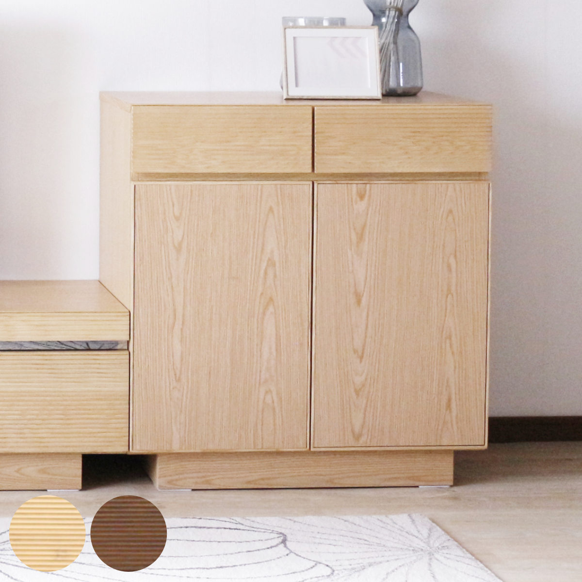 ● 和と北欧の要素を取り入れたジャパンディスタイル「AGUERO / アゲロ」北欧デザインの中に和を取り入れたジャパンディスタイルは、天然素材の温かみがありながらミニマルでスマートな印象を演出します。左側の前扉にポイントとなるアクセントカラーを入れることで、コンテンポラリーな印象に仕上げました。● 天然木が美しい引き戸引き戸の前面には天然木を使用しています。指先触れる格子部分には、贅沢にオーク無垢材を使用しています。※天然木を使用した商品の注意点についてオークには「虎斑」と呼ばれる細胞組織があり、木材を製品に加工した場合必ず材面に模様が現れます。天然木特有の風合いの為、ご理解いただきますようお願いいたします● やや低めの高さ設計テレビを設置して、ダイニングテーブルと合わせた時にも、ちょうど