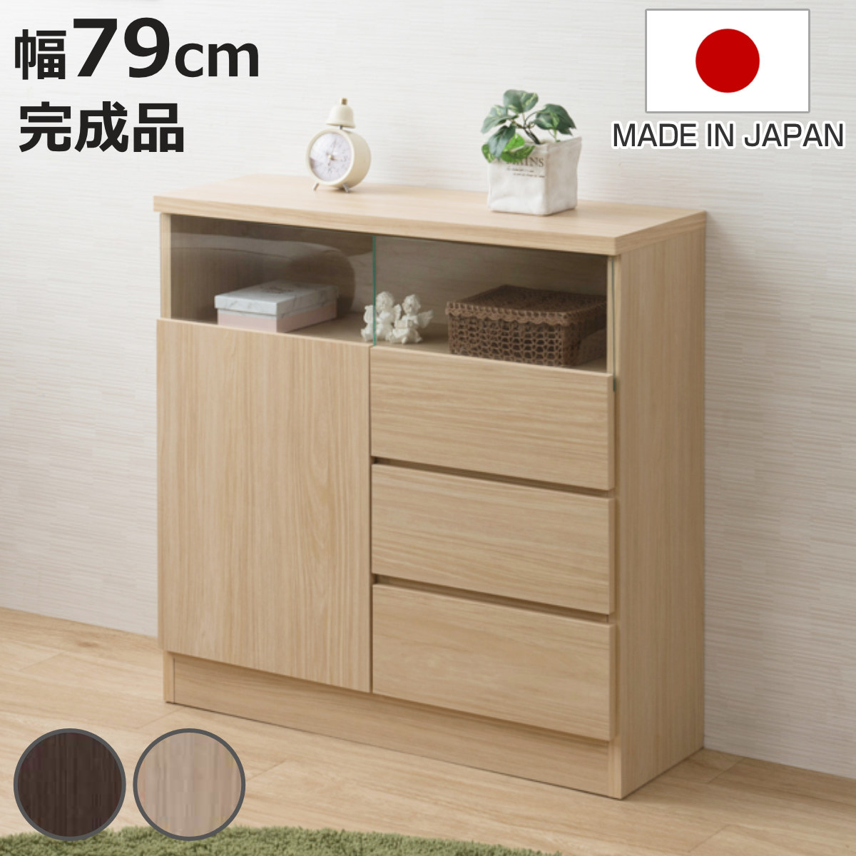用途にあわせて幅広く使えるキャビネット「ナイス」衣類や本・雑誌、文房具や貴重品などさまざまなものの収納棚として使えます。扉収納は可動棚で高さの調節が可能。背の高いものを収納したい場合は、可動棚を外して収納することもできます。背面には安全面に配慮した揺れ防止具付きです。カラーバリエーションは3色展開。ブラックのアクセントで引き締まって見えるナチュラル、清潔感のあるホワイト、どんなお部屋にも合わせやすいダークブラウンから選べます。【商品サイズ(約)】幅79×奥行39×高さ71cm【梱包サイズ(約)】88×44.5×23cm(33.5kg)【材質】プリント紙化粧パーティクルボード【生産国】マレーシア【備考】組立品(プラスドライバー・ハンマーが必要)