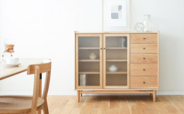 何に分類されるでもなく、増え続ける小物の数々。思い切って断捨離を・・・とは言っても、思い出の品だったり、いつか使いそうなものであったりと、なかなか進まないものです。そんな悩みをお持ちの方におすすめしたいのが、このサイドボード。左側にはかすみガラスの扉の収納棚、右側には深さの異なる引出しが5杯もついています。安定感のあるシンプルなデザインは、設置することによってむしろ安定感を生み、置き場所に困っていた本や置物なども見やすくたくさん収納できます。そしてすべての角を丸く加工することで、非常にやさしい雰囲気に。ふいに体をぶつけてしまっても、ケガをしにくい安全設計です。そしてこのサイドボードならではの魅力は、なんと言っても「かすみガラス」。うっすらと見える姿は、中身の確認と適度に隠すと