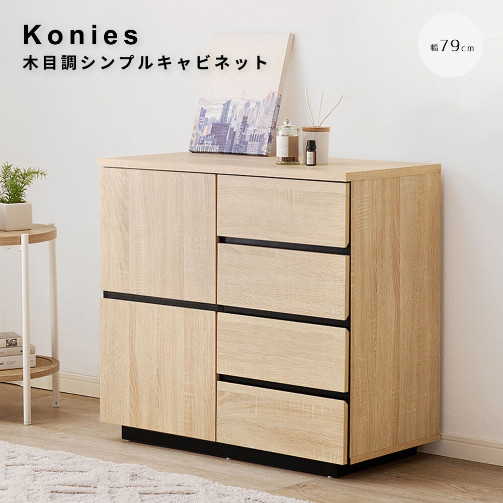 ■木目調シンプルキャビネット 木目調 引出し 引き出し 4段 扉 可動棚 スライドレール ラック サイドボード 収納棚